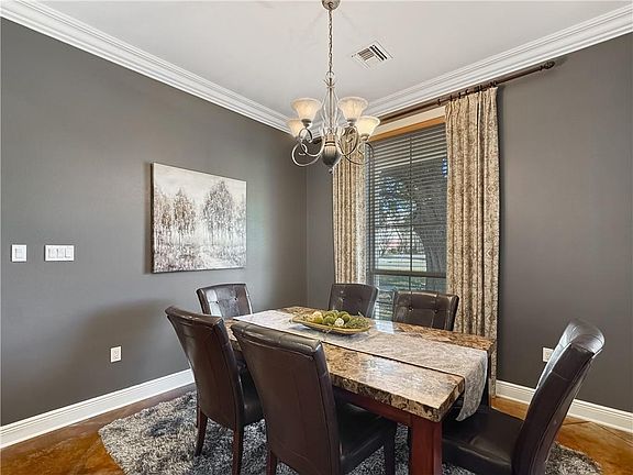 The heart of the home reveals a spacious open floor plan, featuring a dining area that seamlessly transitions into the chef's delight kitchen, complete with ample counter space, a full-size double oven, gas cooktop, and a welcoming breakfast bar with additional seating. High ceilings soar throughout the home, enhancing the spacious feel, particularly in the living room with its eye-catching step ceiling and double-sided fireplace, creating a perfect ambiance for relaxation and entertainment.
