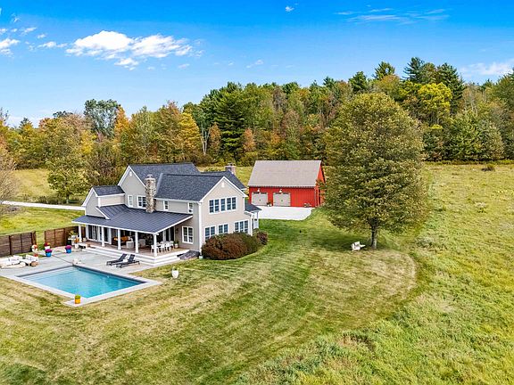 This stylish farmhouse is perfectly situated on 13 acres to take advantage of stunning panoramic Green Mountain views with a classic red barn and a resort-like outdoor space. The spacious, open concept interior features hardwood flooring throughout, exposed beam accents, and windows all around to offer views from every room. At the heart of the home, the kitchen makes entertaining a breeze with a walnut island, breakfast bar, granite counters, and stainless appliances. Unwind in the living room while the fire crackles in stone fireplace or find comfort in the warmth of the wood stove with stone surround in the family room. The primary suite is a true retreat with a cozy sitting room with built-ins, a sliding barn door to the private bath with separate vanities and a glass walk-in shower, custom closet system, and sweeping mountain views. The finished lower level extends your living space with a rec room with built-ins and small wet bar. The property delivers exceptional outdoor living with the mountains as the backdrop. A covered teak deck provides room for a relaxing seating area as well as outdoor dining. Step down to a blue stone patio that surrounds the tranquil inground pool, with space for lounge chairs, your barbecue, and a seating area around the outdoor fireplace. All of the peace and beauty of country living balanced with convenient access to I-89, just 8 miles to Williston shops and restaurants, and 17 miles to downtown Burlington.
