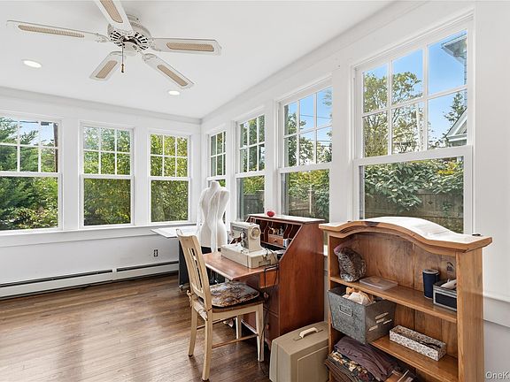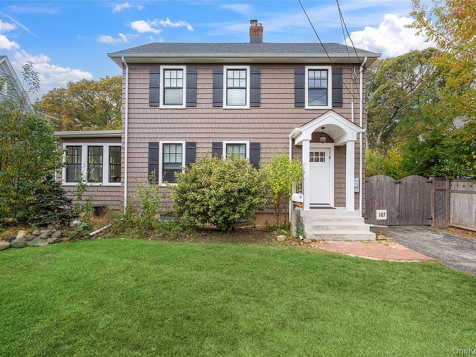 Nestled in a picturesque neighborhood of Huntington Estates, this classic 1920's Colonial exudes timeless elegance and charm. This home sits on .33 acre, minutes from downtown Huntington village. Inside, you’ll find the formal living room with wood burning fireplace, a charming window-lined sunroom, bathed in natural light with a full closet and brand new bathroom. This room is perfect for an office, den or guest room. Steps away is the updated kitchen, featuring wood cabinetry with ample storage. The rich tones of the cabinetry beautifully complement the stone countertops, which offer a durable and stylish workspace for culinary endeavors. Thoughtfully designed for convenience, the kitchen is strategically located adjacent to the dining room, allowing for effortless transitions between meal preparation and dining.  Oak floors throughout the first floor offer a sense of continuity that ties the entire level together. The second floor boasts three generously sized bedrooms, with large windows, allowing natural light to fill the rooms, creating a bright and welcoming atmosphere. A full updated bathroom completes the second floor. The pull-down attic stairs provide easy access to a full unfinished attic, offering endless possibilities for future expansion or storage.