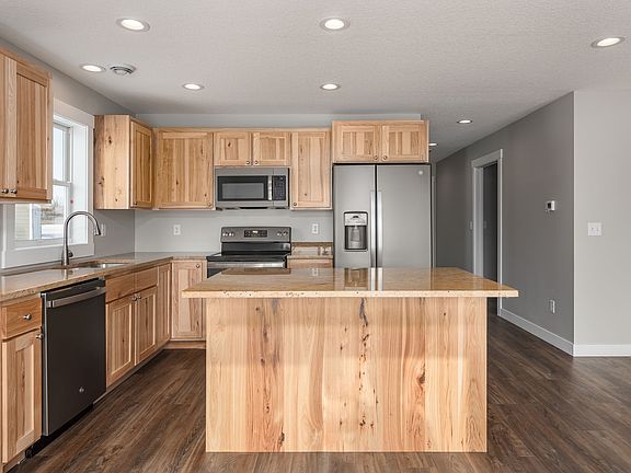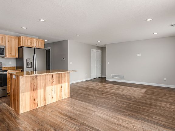 An open concept with south and west exposure provides an abundance of natural light and beautiful finishes throughout. Large eat-in kitchen with brand new everything! Flawless granite countertops, custom cabinetry, farmhouse sink, desired center island/breakfast bar, side by side refrigerator, stove, microwave and dishwasher. From the dining room you have a seven-ft patio door to the backyard. Enjoy our breathtaking Minnesota prairies and skies while sitting on your paved patio. The home offers luxury vinyl plank flooring throughout.