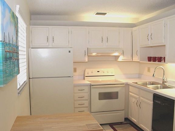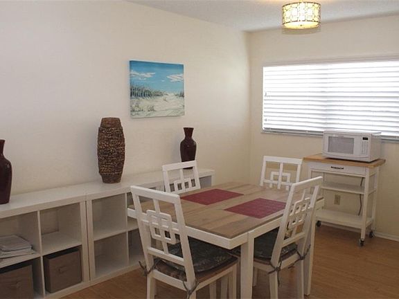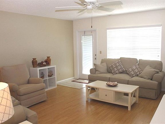 Fully furnished and ready for seasonal enjoyment! First floor condo with honey-oak, laminate floors and updated bath vanities! Two bedrooms and two full baths. Enclosed porch overlooks northern, grassy area. Community washer, dryer are just a few feet away! Active 55+ community with 4 clubhouse/pool facilities! Less than 5 miles to the beach!
