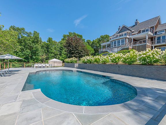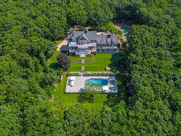 Approaching the gated entry, you will appreciate this dramatic home's seclusion, abutting 100 acres of reserve and privacy from neighbors, yet its close proximity to village life in Sag Harbor (4 min) and Bridgehampton (6 min). Situated on 4.8 spacious, hill-top acres, this elegant estate was totally renovated in 2021 and offers a 3-level 6,000 +/- sq. ft. home with 5 bedrooms, 5 full and 2 half baths. Upon entry, you are immediately greeted by double-height cathedral ceilings with beaming light in the living room and a sparkling marble fireplace. Pass through the large formal dining area to the lovely sitting room with coffered ceilings and fireplace leading to the chef's kitchen. The kitchen is sleek with modern stainless-steel countertops, large marble-topped center island with sink, and high-end appliances. Plus, 2 separate covered outdoor areas off the kitchen and living room for lounging and dining. Also on the first floor are 2 en-suite bedrooms, including the junior primary with double-height ceilings and loft space. Upstairs, the spacious primary bedroom suite has dramatic cathedral ceilings, fireplace, and water views of Noyac Bay from a private wrap-around balcony, gracious bathroom, and generous walk-in closet. An additional en-suite bedroom is located upstairs with shared access to the same large balcony. The well-equipped finished lower level is designed for year-round use with a walk-out egress, family/game room, beautiful wet bar area for entertaining, bonus room/6th bedroom, and access to the attached 2-car garage. Enjoy easy outdoor living with all the exterior accouterments including an all-weather north/south facing tennis court, brand-new saltwater gunite pool and oversized spa. Perfect for summertime entertaining with nearly 2,000 sq. ft. of bluestone patio and 2 covered porches. All of this located moments from world-class golf and Village shops and dining, this definitive Hamptons estate has something for everyone.