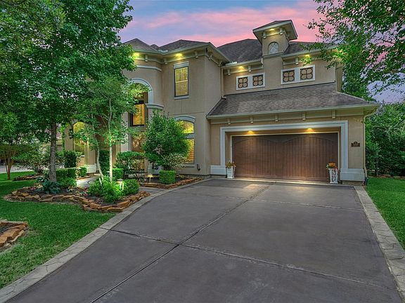 Located in the highly sought after Spyglass section of Woodforest, this custom Partner In Building home blends refined elegance with thoughtful design. NEW ROOF to be installed! The Entry shows off Stunning vaulted ceilings with curved staircase & expansive windows that flood the home with natural light. Vaulted wood-beamed ceilings, 4” plantation shutters, motorized shades in living room, and smart lighting system are just a few perks. Tons of space for entertaining with the formal dining room, study, secondary living/dining and rotunda area to back porch. Primary plus second bedroom down. Upstairs offers 3 bedrooms, media room, and desk area. Step outside to your own oasis. The screened patio with fireplace and kitchen lead to a SALTWATER POOL with SPA, deck jets, fire bowls & infinity waterfall. 3-car tandem garage with epoxy floor. Close to Pine Market's shopping, dining, and entertainment. Zoned to Montgomery ISD and Lake Creek High School
