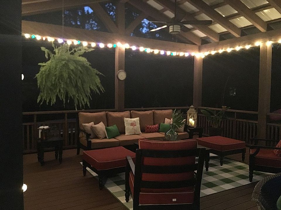 Separate kids TV room from main living space. Outdoor seating area with in-ground pool.