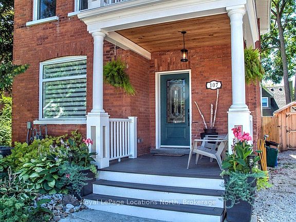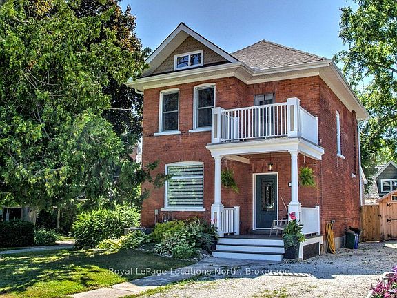 This stunning red brick home in Meaford sits within walking distance of shops, restaurants, trails, parks and Georgian Bay. The two and a half storey layout offers impressive decor, numerous updates, natural light, high ceilings, and spacious rooms. Enjoy family gatherings and entertaining in the open concept living area with ambient lighting, gas fireplace, large windows, adjoining dining room and spectacular kitchen which includes island with seating, ample storage, in cabinetry lighting, stone counters and pantry. The front foyer, two piece bathroom, laundry and walk out to yard complete the main level. What truly gives this home its character are the original wood staircase, corbel details, dual columns, creative tile features in the foyer and on the fireplace and kitchen backsplash. The second and third levels of this home continue to impress with a walk out balcony, vaulted ceiling in the front bedroom and skylight in the third floor primary suite. With four bedrooms in total and bathrooms on every level, this home is functional and convenient. The outdoor space is as inviting and pleasant as the indoor space. The covered front porch, beautiful gardens and rear fenced yard with deck and patio provide a selection of areas to enjoy the outdoors without leaving home.