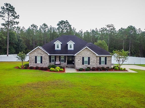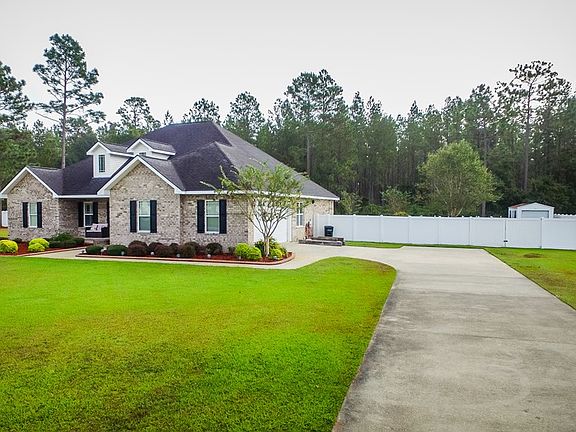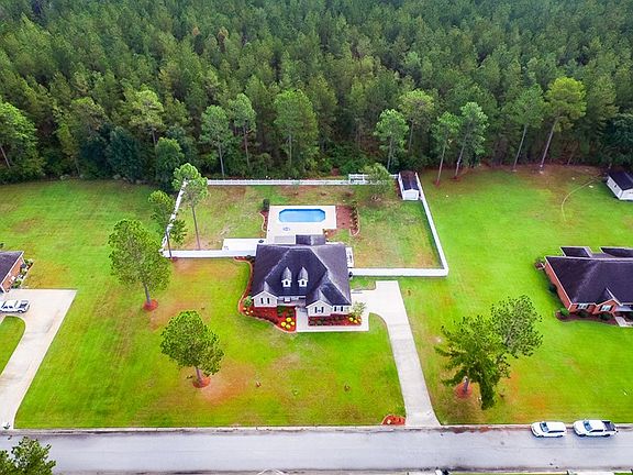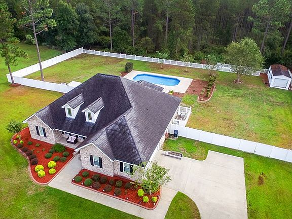 Spacious home with bonus room. Tray ceilings in many rooms, double tray in Master. Tile shower in Master with separate tub and dual sinks. Tile flooring is in all bathrooms and sunroom. The remainder of home is graced w/ wood flooring. The kitchen has custom-build cabinetry by Wasdin Cabinets along with granite countertops and stainless appliances. There is just over an acre with sprinklers and a shallow well. Yards are landscaped adding curb appeal. Vinyl fencing separate front and back yards and gives privacy around saltwater pool which is surrounded by custom pain with SprayTech. Storage building is great for extras and seasonal. The home is finished with plantation shutters and property is bordered with forest on east side.