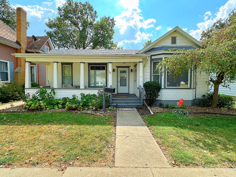 This appealing 2 bedroom home perfectly blends classic charm with modern upgrades. From the inviting curb appeal and covered front porch to the spacious interior, this home is sure to impress. Step inside to find a spacious, light-filled layout accented by unique light fixtures, stained glass windows, and thoughtful improvements throughout. The bright living room features large windows that fill the space with natural light, while the updated kitchen showcases new flooring, a stylish backsplash, freshly painted cabinets, table space, and a walk-in pantry offering abundant storage. The formal dining room provides plenty of space for gatherings and features a large picture window. The oversized primary bedroom offers an abundance of built-in storage, and the second bedroom features a deep closet and eye-catching sliding barn door. The spacious bathroom includes a double vanity, tub/shower combo, and generous built-in storage. Convenient main-level laundry adds everyday ease. The full basement with tall ceilings provides excellent storage and includes built-in shelving. Outside, you'll love the fenced backyard with a paver patio, relaxing pond, and lush landscaping that's earned designation as a "Monarch Butterfly Way Station." The deep one car garage adds the convenience of enclosed parking and even more storage space. Recent upgrades include a new roof, all new electrical wiring, PEX plumbing, freshly painted garage exterior, and tuck-pointed and painted foundation. Come experience how this home combines character and comfort with quality updates!