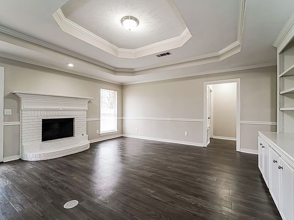 Inside, the bright living room welcomes you with a tray ceiling, crown molding, and LVP flooring that runs throughout the home, adding both elegance and easy maintenance.