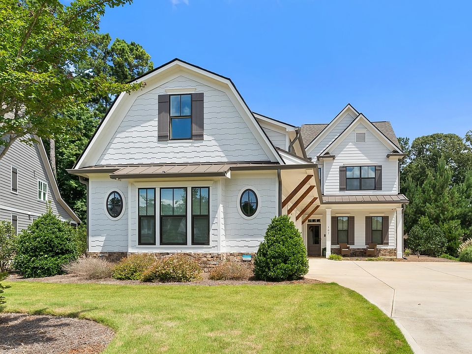Welcome to 107 Wingspan Way, a beautifully crafted farmhouse-style home nestled in the prestigious gated community of Cuscowilla on Lake Oconee in Eatonton, Georgia. Built in 2020 and once the community’s model home, this residence offers 4 bedrooms, 3.5 bathrooms, and approximately 2,753 square feet of upscale living space. From the moment you arrive, you'll be charmed by the hardy plank and cedar siding, stone accents, and the inviting flagstone front porch leading to a spacious 3-car barn-style garage—perfect for vehicles, a golf cart, or lake toys. Step inside to discover wide-plank hardwood floors, soaring ceilings, and a cozy gas fireplace in the open-concept living area. The gourmet kitchen boasts stainless steel appliances, quartz countertops, ample storage, a pantry, and elegant lighting—ideal for entertaining or everyday living. The main-level owner’s suite features a luxurious en-suite bath with dual vanities, a garden tub, separate shower, and direct access to the laundry room. Upstairs, a large bonus/game room with built-in speakers and a full bath offers flexibility, while two additional bedrooms share a Jack-and-Jill bathroom. Outdoor living is equally impressive, with a covered back patio complete with a stacked-stone fireplace that invites evening relaxation. Located just a short walk from Cuscowilla’s resort-style amenities—including a nationally acclaimed Coore-Crenshaw golf course, pool, tennis courts, clubhouse, lake access, fitness center, and more—this home blends comfort, sophistication, and convenience. Additional upgrades include epoxy garage flooring, propane and electric HVAC with heat pump, crown molding, smart-home features, and a water softener system. A $15,000 seller credit is available toward a golf membership, adding even more value to this already exceptional home. 107 Wingspan Way is truly turnkey lake-living at its finest.