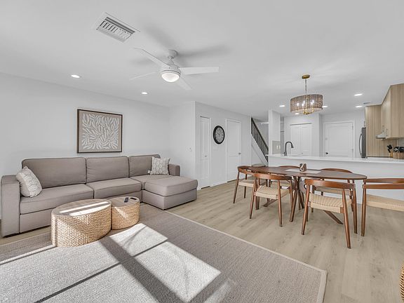 Welcome to 107 Wooden Mill Terrace, a beautifully reimagined two bedroom, two and a half bathroom townhome in the heart of Jupiter. Taken down to the studs and rebuilt with a Scandinavian-inspired contemporary aesthetic, this residence offers clean lines, timeless finishes and worry-free living with all-new systems and upgrades.Step inside and be greeted by fresh Benjamin Moore paint, luxury vinyl plank flooring and a bright open layout. The custom kitchen is a true showpiece featuring flat-panel cabinetry with birch interiors, Blum hardware and Hettich drawer slides. The sleek Lioher Cava-style doors are complemented by striking Carrara quartz countertops with elegant brown veining and brand new stainless steel appliances. The bathrooms have been completely transformed with frameless glass shower doors, custom vanities and all-new Kohler fixtures and toilets creating spa-like retreats. Upstairs, brand-new stairs and railings add architectural detail and a touch of sophistication.