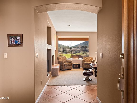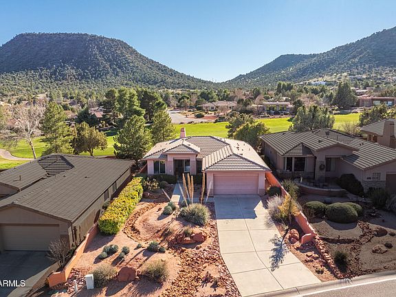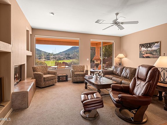 An attractive compact low maintenance single level 3 bedroom 2 bathroom home enjoys the natural beauty of the Red Rocks, including Bell Rock, from the front. To the rear, the covered back patio has views of the desert green landscape of the Mesa. It also runs alongside the fairway of the 5th Hole of the popular Sedona Golf Resort. You can also see the lake that sits in front of the 5th Tee. The elevated ceilings and large windows give the home a warm but open feeling, bringing the outside in. Split floorplan. Main Bedroom with en-suite bathroom and two bedrooms with bathroom in between. This home enjoys two other bedrooms, one of which could easily be utilized as an office, den or work out room. The home is genuinely one level, with no steps or differing levels to negotiate. The wood burning fireplace in the living room has never been used by the current Owners.