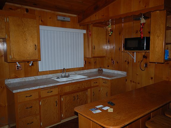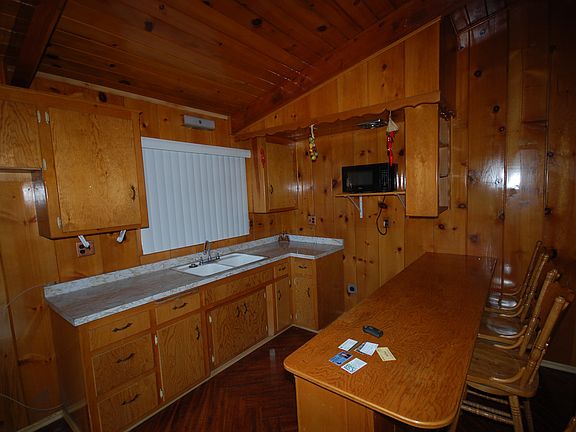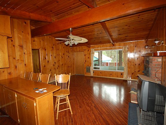 Very nice cabin walking distance to town in great condition. Beautiful front porch and very nice back patio deck with two large pine trees. Great parking in back for recreational vehicle etc behind detached two car garage.