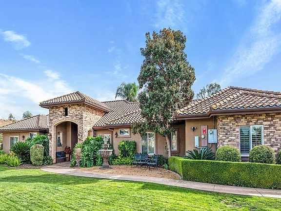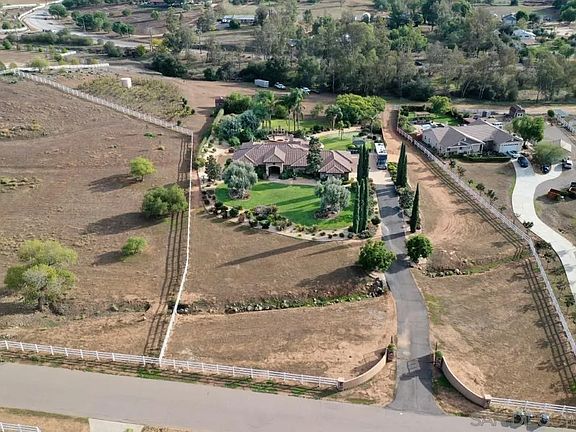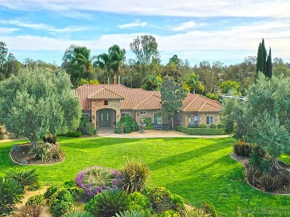 One-of-a-kind Tuscan retreat in the Heritage Ranch neighborhood of Ramona situated on a meticulously landscaped, 6.11 acre lot complete with it's own well/city Water and solar, a Sauvignon Blanc vineyard, putting green, outdoor poolside fireplace, gourmet outdoor kitchen, and fruit trees/garden. Attention to detail and quality throughout this tropical paradise with expansive lot. This home has an oversized kitchen with 6-burner stovetop, SS Viking appliances, wine fridge, vegetable sink, pantry, and endless countertop space for buffet style gatherings with room leftover. Gorgeous sightlines from the kitchen to the DR, FR, and LR. Incredibly functional layout conducive to entertaining and privacy with primary bedrooms situated on a separate side of the home from the entertaining space. Two bedrooms near the primary bedroom have a jack-and-jill bathroom. Fourth bedroom is an en-suite, perfect for an in-law quarters or guest bedroom. Private office space that is light, bright, and has a beautiful outdoor view. Expansive laundry room with clothing rack, sink, and a plethora of countertop space and storage space. Oversized 4-car garage with epoxy flooring. Land boasts plenty of room for multiple vehicles, RV parking, and all of your toys. There is a dirt road to the west of the home, where it gives you access to the back of the property where there is room to roam. This gorgeous, Tuscan retreat has all that you can ask for... 6.11 acres of land and a beautiful home with a meticulously decorated backyard and front yard. Come see it today before it's gone!