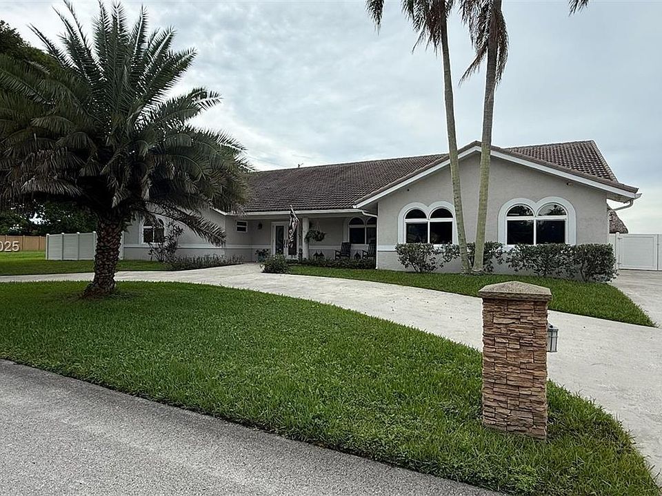 Spacious 4-bed, 3.5-bath home designed for comfort and entertaining. With its impressive size, premium features, and resort-style outdoor living, this home is truly one-of-a-kind. Open floor plan with expansive living and dining areas, a chef’s kitchen, and abundant natural light. Finished extra flex space in the attic for an office or play room. Two bedrooms have ensuites, with the oversized primary suite as an private retreat. The metal roof has a barrel tile aesthetic while providing long-term durability. Central vacuum system, solar water heater and soft water filtration system. The oversized 2-car garage provides plenty of room for storage. Backyard paradise: large tiki hut with outdoor kitchen, oversized saltwater pool, and generous patio for gatherings, relaxation, and fun.