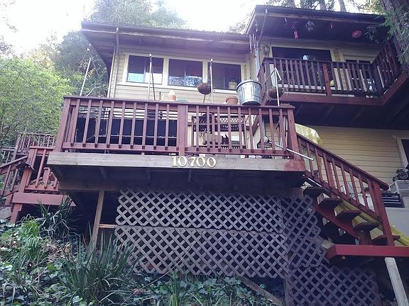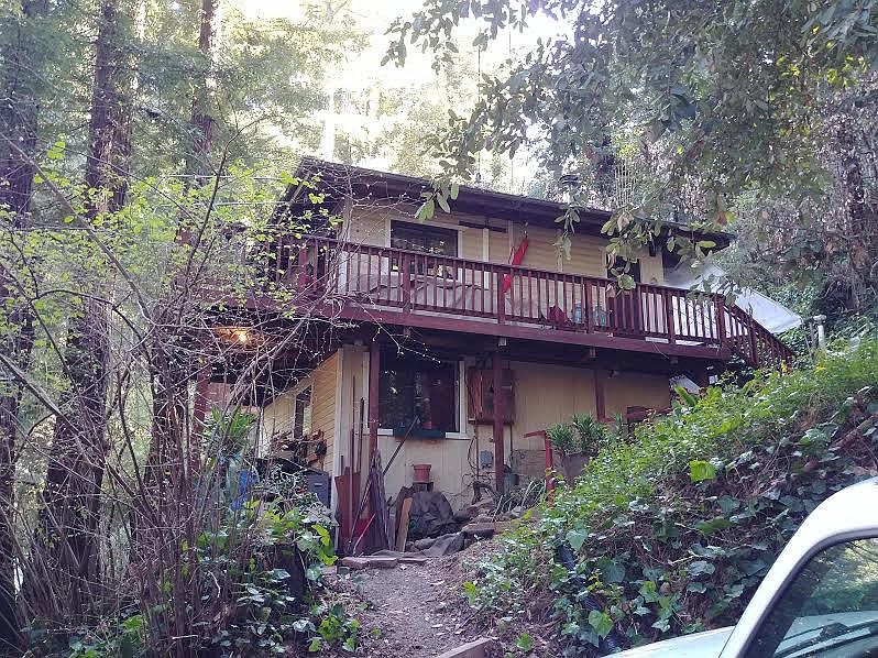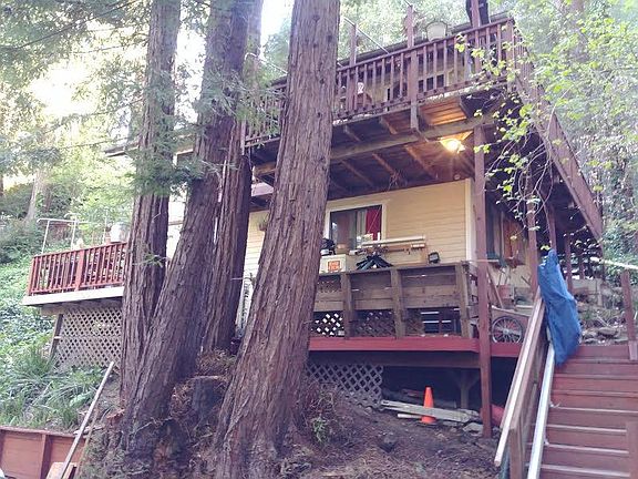 Come home to the redwoods near Loch Lomond. Enjoy the clean air and views of redwood trees from the spacious decks. Remodeled interior, 3 skylights. Cathedral ceiling and an airtight wood stove in the living room. Forced air heat as well. Upstairs is bedroom which leads onto a deck. Down the other stairs is another bedroom which also has a separate entrance. Laundry space is down there as well as 1/2 bath and office/storage room. Custom cabinets in the kitchen and upgraded appliances. Separate bonus studio/room, no bath, not included in square footage. Owner prefers to sell the house furnished.