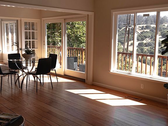 Start your day with a cup of coffee on the front porch, watching a family of Turkeys saunter by. In this tranquil Cul-de-Sec, that's the only traffic you'll ever encounter. Immerse yourself in a terraced garden of cherry blossom trees, David Austin roses, and fruit trees ripe for picking. Enjoy the fully fenced backyard offering breathtaking views over Grass Valley. Step through the wooden gate into Knowland Park, perfect for a day hike with vistas overlooking the Oakland Zoo. Return to a sunlit living area featuring hardwood floors with an open floor plan that seamlessly connects the kitchen, dining room and an adjoining office/studio. Large sliding doors open to both cozy front porch and spacious back patio. The kitchen boasts Stainless-steel appliances and a charming bay window that looks out onto the backyard. A staircase leads from the laundry room to spacious two-car garage and a convenient storage nook. Just five minutes down the hill, you will find Starbucks, restaurants, supermarkets, and easy freeway access. This home is a unique haven for nature lovers & anyone seeking a serene escape from the bustle of modern life.