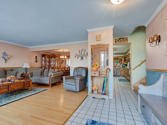 If space matters, this custom expanded split-level offers plenty of room for entertaining, relaxing, and comfortable everyday living. Step inside to a gracious foyer that flows into the open living and dining room combination, featuring beautiful hardwood flooring, custom chair rail, and crown molding. The spacious kitchen provides ample cabinetry, generous counter space, a center island with breakfast bar, a large skylight, and ceramic tile flooring that continues into the adjacent casual dining area. This area opens to a voluminous family room with a cozy fireplace and vaulted ceilings highlighted by architectural ceiling beams. Upstairs, you'll find three generously sized bedrooms, all with hardwood flooring. The lower level offers a large recreation room, (currently used as a fourth bedroom) and a laundry room with washer and dryer. The fully privacy-fenced backyard is perfect for outdoor entertaining, featuring a large concrete patio and a storage shed for added convenience. Fantastic location-just a short (12-minute walk) to the train and minutes from shopping and restaurants. Schedule your viewing before someone else calls it home!
