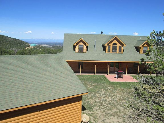 This magnificent custom log home is located just east of Trinidad in the exclusive gated community of the Reserve at Soldier’s Ridge. Situated on the flanks of Fisher’s Peak on a 35.10± acre treed lot, this 2007-built home offers 4,834± sq. ft. of living space with a total of 6,500± sq. ft. under roof when including the beautiful wrap-around porch. The home offers 4 bedrooms and 5 bathrooms with an oversized, detached 3-car garage. There is also a walk-out basement with wet bar and plenty of room for entertaining. There are numerous custom touches throughout this lovely home such as granite countertops, hardwood and tiled floors, stone fireplace, and steel appliances. There is also a secret “safe room” located behind a remote controlled bookcase. The views of the surrounding mountain ranges are nothing less than spectacular. Water and sewage handled via a well and septic system. Gas is from a 1,000 gallon propane tank. This home has been exceptionally well-maintained and shows the pride of ownership. 2013 Taxes: 806.20. MLS #:14-463. $680,000.
