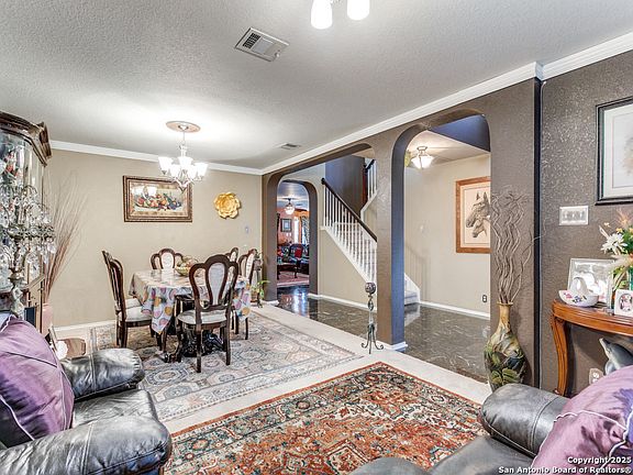 Don't miss out on this beautiful 4 Bedroom, 2.5 Bathroom home on corner lot with open floor plan designed for both entertaining and everyday living. The kitchen is a chef's dream-featuring mahogany-stained cherry cabinets with glass doors, granite countertops, stainless steel appliances, and wine chiller. The home also boasts two spacious living areas, two dining spaces, and a cozy fireplace. The downstairs spacious bonus room can be used as a study/office/gym or bedroom. Upstairs, the oversized primary suite offers a true retreat with a spa-style bath including garden tub, separate shower, dual vanities, and an enormous walk-in closet. Three additional large bedrooms, an upgraded bathroom with skylight, and a game room provide plenty of space for family and guests. Location is unbeatable-just off Potranco Road with quick access to Loop 1604, Lackland & Kelly AFBs, SeaWorld, shopping, dining, and everyday conveniences right across the street.