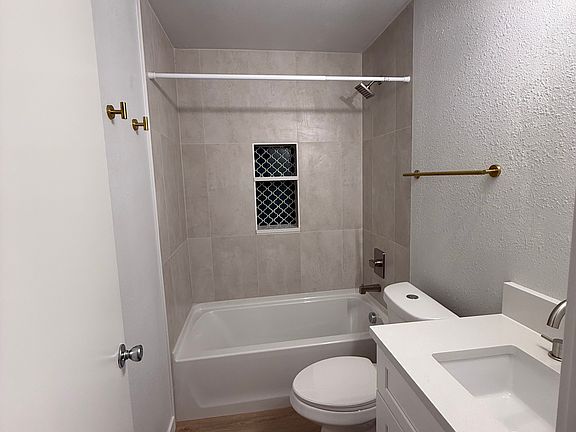 Stylish bathroom with upgraded vanity, fixtures, and tiled shower/tub