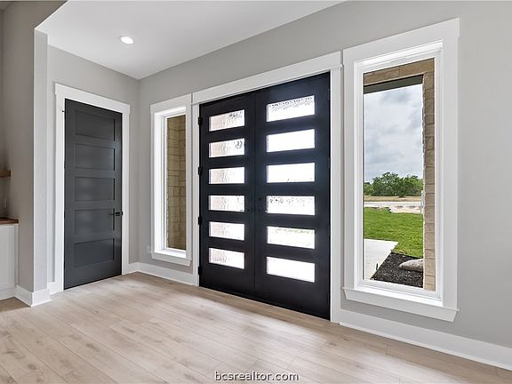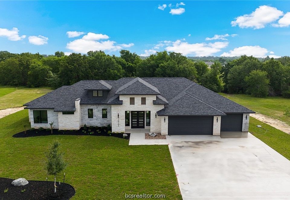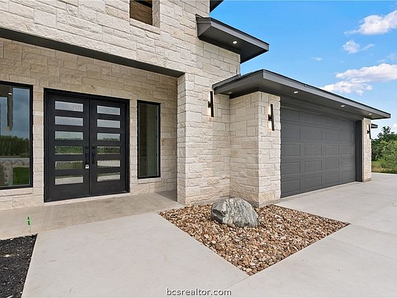 Discover the epitome of luxury living in this stunning new construction home, situated on 1.24-acre lot backs to a creek and wooded line. This property offers privacy and a serene setting. Spanning 2,960 sqft, seamlessly blends contemporary style with traditional elegance. The expansive living area, highlighted by a floor-to-ceiling stone fireplace, is surrounded by large picture windows and double sliding glass doors, ensuring the space is bathed in natural light and provides picturesque views. The kitchen is a focal point, equipped with large island, quartz countertops extending up as backsplash, double oven, gas range, and fabulous hidden pantry. The kitchen opens to spacious dining area and secondary living space, enhancing the home's functionality. Both secondary baths combine luxury with practicality featuring double vanity, walk-in shower, and tub. Primary ensuite promotes a spa like feel with a stunning walk-in shower and soaking tub plus a glam vanity in closet. Outdoor living is elevated with kitchen and covered patio, complete with surround sound—ideal for entertaining or relaxing evenings. Other features include 3-car garage with an electric charger that fits an F250, efficient electric heat pump system. Ample exterior lighting accents the elegant architecture and beautiful landscape, making this home a sanctuary of comfort and convenience in College Station’s newest rural development. Conveniently less than 7 miles from shopping, groceries, and retail amenities.