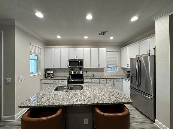 Designer kitchen with granite countertops, stainless appliances, and oversized island