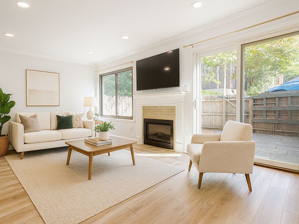 Charming fireplaceFinished lower levelFully renovated bathsPrivate patioLarge windowsAbundant natural lightSeparate dining room