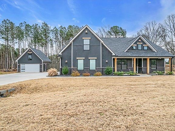 No HOA or restrictions! This practically new 1.5-story Craftsman-style home, built in 2022, sits on a fully fenced 1.51-acre lot with a private driveway leading to the entrance. The main level showcases a beautifully designed open floor plan featuring three bedrooms and two full baths. One of the bedrooms, with elegant French glass doors, can serve as an office. The kitchen boasts ample cabinetry, quartz countertops, a tile backsplash, a farmhouse sink, a pantry, a large island, and stainless steel appliances, all overlooking the cozy great room with a coffered ceiling and an electric fireplace. Adjacent to the kitchen, the formal dining room is accented with a stylish shiplap wall. Natural light floods the main living areas, creating a warm and inviting ambiance throughout. Laminate flooring extends throughout the entire home except bathrooms and walk-in laundry room. The primary suite is a true retreat with a tray ceiling, double vanities, a walk-in closet, a tiled shower, and a separate soaking tub. Upstairs, a flexible space serves as a fourth bedroom or flex room, complete with a full bath and closet. Enjoy peaceful mornings on the screened-in porch overlooking the serene backyard. The property also includes a spacious detached garage/shop with heating, cooling, and ample storage space. Security system does not convey with the sale of the house.