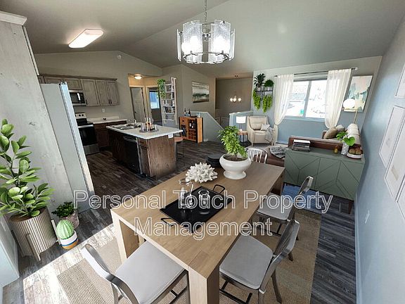 The open living area is filled with natural light and offers plenty of space to relax or entertain, while vaulted ceilings add an airy touch. The kitchen includes stainless steel appliances, a glass-top stove, kitchen island, and generous cabinetry for effortless organization.