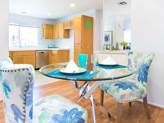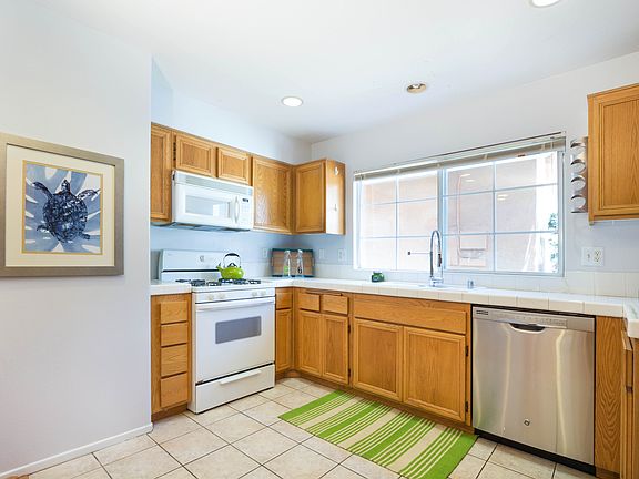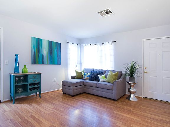 Bright open detached townhome in secure gated community. Three Bedroom, 2 Bathroom laminated flooring in dining area and living room. Clean bright white tiled kitchen with ample storage. Oversized two car garage with laundry hookups. Community has two sparkling pools, a gym, bbq and playgrounds. 24 hour security. Must see!