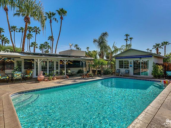 Situated in the desirable Tahquitz River Estates neighborhood, this mid-century ranch is gated from the street, featuring stunning views of the San Jacinto Mountain range. The main house has 2 bedrooms and 2 baths with an additional separate En-suite Casita, offering the 3rd bedroom and 3rd bathroom-Total SF is approx. 1,533. Cascading koi pond on a 10,000+ SF private lot. Feature highlights include, In/outdoor living with French doors leading to the covered patio and 36' by 18' pool, open concept floor plan with breakfast and wet bars, central HVAC in the main house and mini-split unit in the Casita, potential for extra income or use Casita as a guest suite, 2 car air conditioned garage with epoxy floor, leased solar system for energy and cost savings, dual paned windows and French doors,plantation shutters in the living, dining and primary bedroom, gas log fireplace, fee land ownership, close to the "Village," restaurants, shopping, entertainment and the weekly "Village Fest".