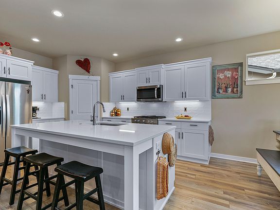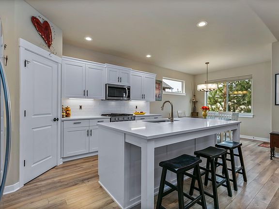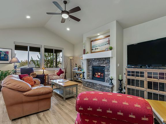 Discover this beautiful single-level home, crafted by Pahlisch Homes, featuring a thoughtful open floor plan with quality finishes throughout like quartz countertops, luxury vinyl plank flooring, undermount sinks, and a masonry faced gas fireplace. Single level home is 1856 sq ft, 3 bedrooms, 2 bathrooms, office, secluded primary suite with a walk-in tub and tiled shower. The 3-car garage offers ample space for a workshop, while the back deck overlooks mature trees and low-maintenance landscaping. Conveniently located near a paved walking path that connects to over 620 acres of public and BLM trails, leading to the protected wetland reserve, Barnes Reservoir, and Barnes Butte trails.