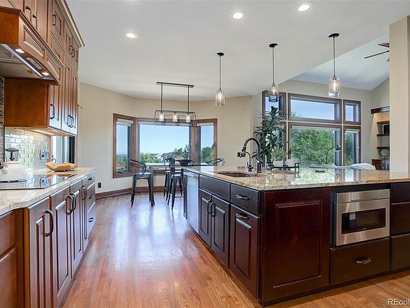 Stunning panoramic mountain & city views, Enjoy 365 days of Colorado Sunsets from this distinctive, 4 bed, 4 bath home nestled on a private cul-de-sac in the much sought-after neighborhood of Mansion Hills in Highlands Ranch. Situated on a large lot with mature trees and professionally landscaped backyard. 5000+ sqFt of buildup beauty of a home, A dramatic 2-story entry welcomes you in with a grand staircase carries you upstairs to a breezeway, connecting an expansive primary suite,5-piece bathroom, fireplace, and walk in closet on one side and a bedroom fireplace large windows to soak up the expansive mountain views, you are drawn into the 2-story family room with a large, gourmet, eat-in kitchen with slab granite countertops and backsplash, tons of storage, large island,with high end appliances.Enjoy outside dining in summer on your multi-tier expansive deck overlooking the front range. The walk-out basement is ideal for entertaining, newly remodeled with a home theater/open family room with a billiard table with a wet bar and a kitchenette. 3/4 guest bath and a home