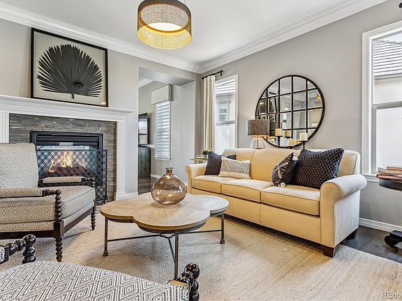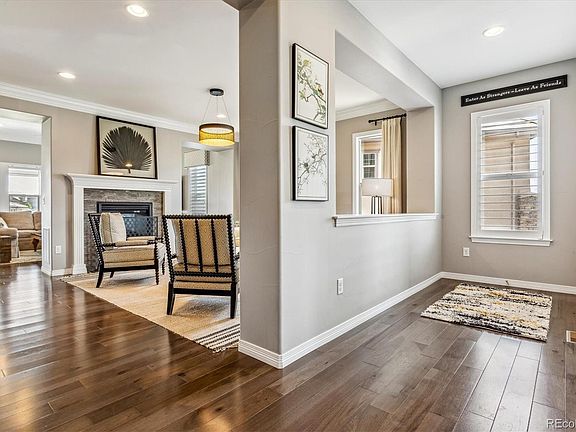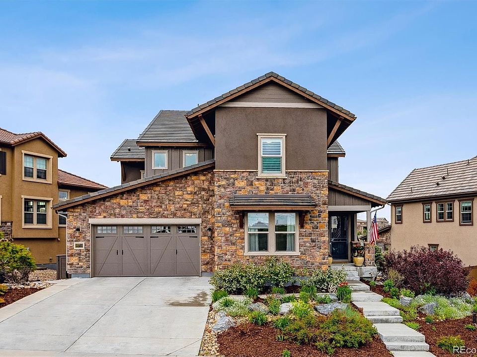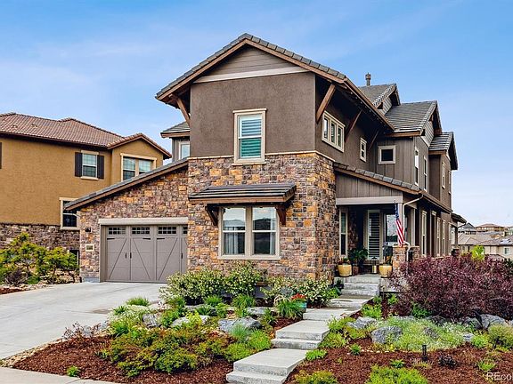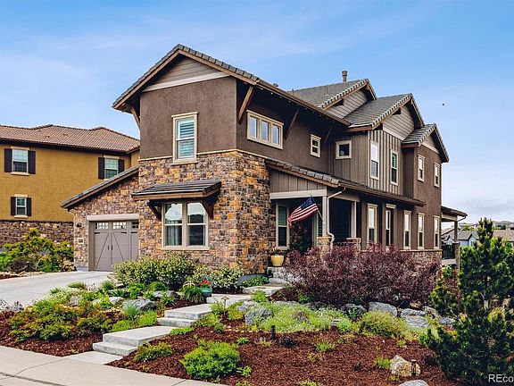 This gorgeous expanded Silvermoon model from the Shea Shadow Walk collection features the upper level media room, a main floor bedroom3/4 bath, and a recently updated gourmet kitchen.  Extensive custom landscaping  is located in the front and back of the home feature an assortment of hardy perennials, ornamental shrubs and trees.  Back yard deck overlooks open space, fire pit seating area, dog proof artificial turf and landscaped boundary plantings.  The home is on the quiet eastern edge of Back Country with open space to the front and back. Walking distance to Mountain Vista High School. The kitchen has a Wolf Six Burner Range, Sub Zero cabinet depth refrigerator, , Wolf double over/micro combination and an ample eating at the island.  Adjacent to the kitchen is a butler’s pantry/coffee bar and a separate walk in pantry.  The kitchen opens to the family room, breakfast casual dining, and second level deck. All have western views to the open space and mountains. The family room shares a double-sided gas fireplace with the formal living room. Living room could be configured as a formal dining room. Main floor also includes a foyer at the front door for greeting guest, front bedroom/office, and  ¾ bath.  Oversized three-car garage has direct access to the main floor laundry room / mud room.  The upper level has the primary suite, five piece bath, a bonus media room/homework area, three additional bedrooms –two are en suite. The fourth upper bedroom is currently configured as an east facing office. Smooth textured hand troweled drywall finishes. The very large Walk out basement level would be easy to customize to your desires. It is currently used a work out space with views to the gorgeously landscaped back yard.  Additional storage space in the utility room.