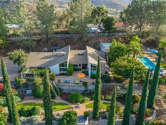 Gorgeous Blossom Valley Single Story Estate is perched up on the mountain w amazing Sunset Views! Gated Entrance greets you to your private driveway w lush mature landscaping and circular driveway w room for all your toys! There are multiple seating areas around the property to enjoy the tranquil views that is so peaceful as well as areas to enjoy the paragliders & birds that call this area home! The Stunning Modern Architectural Design offers plenty of sunlight, vaulted ceilings and breath-taking views out almost every window! The Gourmet Kitchen offers Custom Cabinetry, Stainless Steel Appliances, Granite Counter-Tops, eat-in nook table area, large island & stunning mountain views from your kitchen sink! The family room offers vaulted ceilings, wet bar w custom cabinetry, wine rack and warm fireplace! The Spacious Master Retreat offers a large walk-in closet, a separate retreat relaxing area w double-sided fireplace, Sliding Glass doors to take you out to the pool area, private home office w its own entrance & A beautiful master bath with jetted tub and stand-up shower! The outdoor is designed like a resort with a stunning pool, jacuzzi, built-in BBQ area with sink and serving area, Pool house changing room w full bathroom, multiple vegetable garden beds, orchard area with mature fruit trees, Owned Solar System, City water & Well water for irrigation, Medicinal home sauna in garage, 10,000 Gal Storage Tank, 3 car garage & an outdoor storage building! Room for horses if desired! This home has been well maintained w newer roof, windows, pool retextured & so much more!