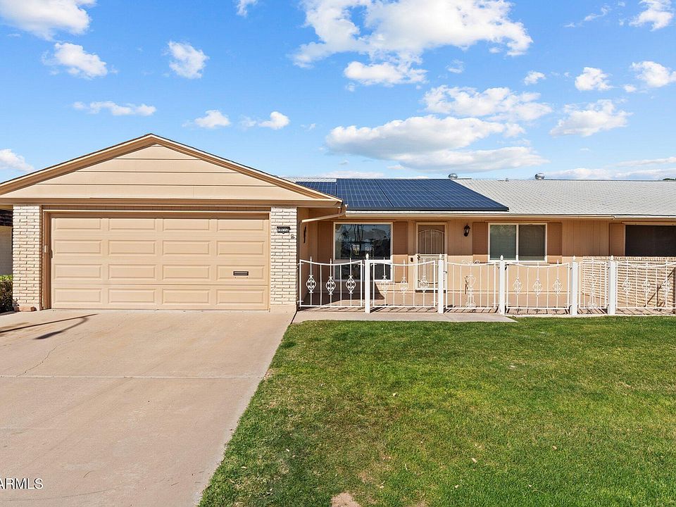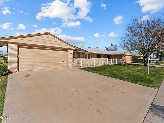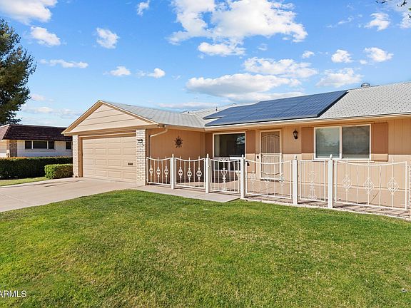 Situated in a quiet golf course community w/in Sun City, this property offers both serenity & accessibility. Maintenance-inclusive HOA is attractive to buyers seeking low maintenance living. The split-bedroom floor plan ensures a peaceful retreat w/bathrooms placed on both sides. Featuring 2 patios, this home offers stylish & functional exterior spaces-perfect for relaxing or entertaining. This home includes updates such as plantation shutters, modern lighting & refreshed kitchen cabinetry. Visit any of Sun City's 7 centers offering pools, fitness studios, hobby workshops, tennis & more! From crafts & clubs to performance theaters, libraries & social halls, discover why staying active makes this home & Sun City a special place to live!