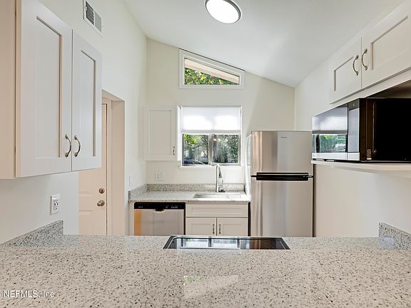 **FENCED BACKYARD**NO HOA**REMODELED** Discover the best of Jacksonville living with this charming 2-bedroom, 2-bathroom home in Sandalwood CC, available for UNDER $200K! This home boasts a beautiful, bright, and cheerful atmosphere, thanks to lots of windows, NEW LIGHTS AND FANS, and stunning VAULTED CEILINGS. The interior has been thoughtfully updated and now features a REMODELED KITCHEN, stylish and woodlike NEW LAMINATE FLOORING, and a desirable added full bathroom to the master suite. You can rest easy knowing the major systems are updated, including UPDATED PLUMBING 2023, a newer AC, and a newer water heater. Outside, the BACKYARD IS FULLY FENCED creating privacy, and offers a lovely stone paver patio perfect for relaxing. Best of all, there is NO HOA, and NO CDD. This is a GREAT LOCATION that puts you so close to the highly coveted St. Johns Town Center and all of its shopping and dining. Schedule your showing today!