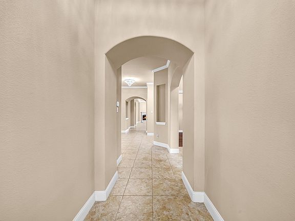 The private primary suite, tucked away at the rear of the home, offers a spa-like retreat with a soaking tub, walk-in shower with built-in seating, and dual vanities with framed mirrors and upgraded fixtures. Secondary bedrooms are generously sized and include deep walk-in closets, ensuring comfort and privacy for family or guests.