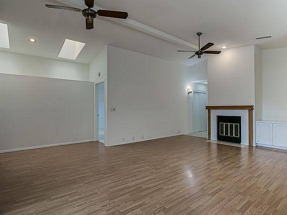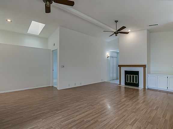 Wood-burn fireplaceCeramic tileCarpet in brsSkylights add natural lightWood-lam floors