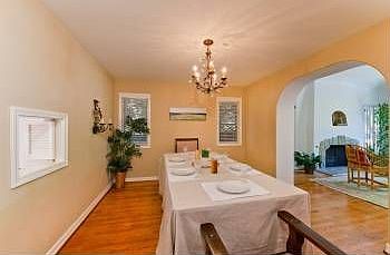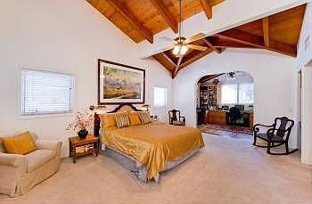 Beautiful 5 bedroom, 4.5 bath, 2-story Spanish home has a fireplace in living room and separate dining room w/hardwood floors. Kitchen with center island, granite counter-tops and breakfast bar flows into light and bright den. French doors off den open to patio and private grassy yard with palm trees. Spacious master bedroom with attached office isupstairs along with 3 additional beds and baths. 5th bedroom w/ceiling fan is conveniently downstairs. Wood beamed ceilings and arched entryways throughout give this perfect family home wonderful character!