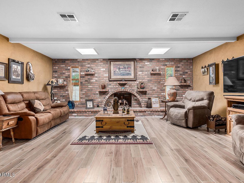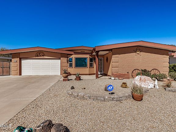 Looking for a new home? You've found it! This lovely 3 bed, 2 bath residence in Sun City features charming curb appeal, a low-care front yard, and a 2 car garage w/built-in cabinets! Come inside to discover a spacious dining & living area w/high ceilings, skylights, elegant wood-look flooring, and custom palette throughout. Continue into the cozy family room, The eat-in kitchen is comprised of oak cabinetry w/ample counter space, a pantry, and all the built-in appliances you'll need for home cooking. The primary bedroom showcases soft carpet and a private ensuite for added comfort. Lastly, the perfectly-sized backyard includes a screened-in patio where you can spend a relaxing Sunday afternoon! Act NOW!