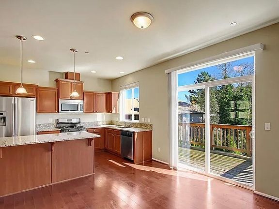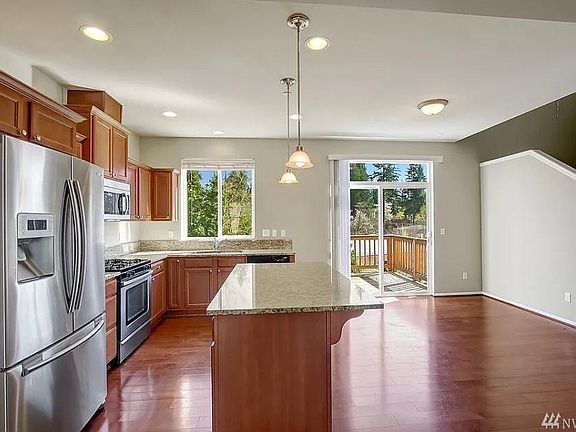 Excellent walkable townhouse in the heart of Downtown Bothell just steps to restaurants, shops, cafes, parks & trails. High ceilings & Large windows, flooded with tons of natural light. Open concept floorplan featuring an impressive Chef's kitchen & dinning space that opens to a expansive deck. Granite slab counters throughout, cozy fireplace, stainless steel appliances, gas range. Large master bedroom w/peek a-boo view of Cascades, en-suite 5-piece bath w/two closets & another spacious bedroom with large closet on upper level. Additional living space on lower level w/walk-in closet & access to backyard. ONE ATTACHED GARAGE WITH EXTRA COMMUNITY PARKING!! Renter is responsible for all utilities. Security deposit, first month + last month rent due at signing. No smoking allowed.