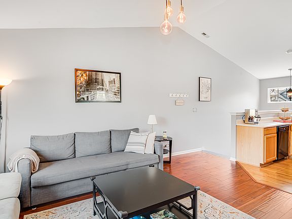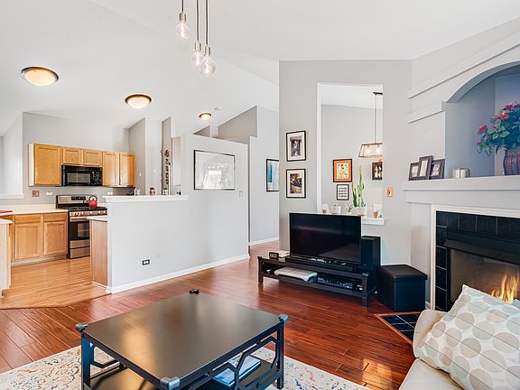 Second floor home with many updates including beautiful scrapped acacia hardwood floors in the living room and dining room. Open floor plan, vaulted ceilings and large great room with fireplace you are sure to enjoy. The dining room can accommodate a large table and features a new lighting fixture and the exit to the balcony. All woodwork and trim and doors are white, and the stairway has been completely redone with hardwood. Most of home has been freshly painted in current tones, and there are ceiling fans throughout. The owners' bedroom is large and has a private bath renovated with upscale travertine, and two closets (one walk in). New windows on master bedroom 2017, living room and two front bedrooms 2022. There is a two-car garage with overhead storage. The North Oakhurst Sports Complex is just two blocks away and has a clubhouse, pool with water slide, tennis courts, volleyball. Outstanding district 204 schools, including Young Elementary two blocks away. It's a short distance to Metra and plenty of restaurants and shopping. MULTIPLE OFFERS, HIGHEST AND BEST DUE 8/19 TUES NOON.