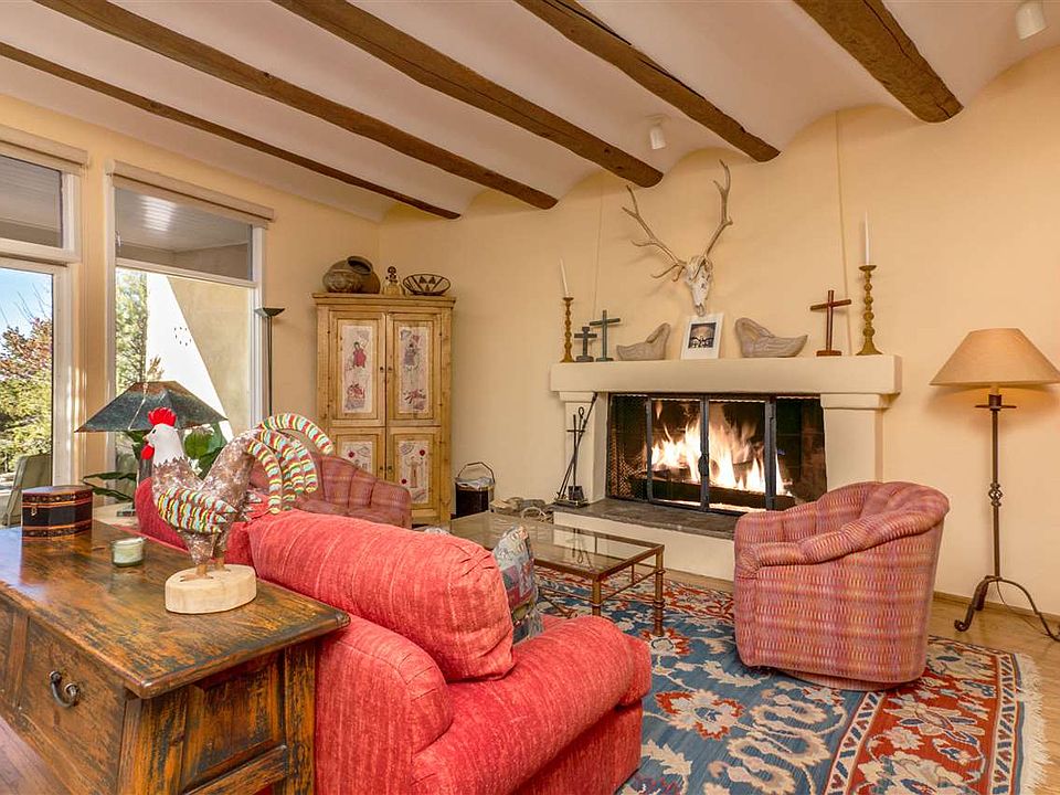 Gracious Mansion Ridge-Traditional Santa Fe house on a very private 2.9 acre lot with views of the city and mountains on the exclusive North side.Very close to town- this beautiful, light filled two bedroom, 3 bath home was originally built by Stamm in the 50's with an addition built in the late 80's which added an expansive family room with a bathroom and kitchenette. Perfect for over flow guests or privacy.Gracious and inviting this feels like Santa Fe style. Wood and flagstone floors, 3 fireplaces, beams and vigas ,tile, new Anderson windows ,new furnace, laundry room, carport with storage and two large outdoor patios off the living areas with views of the Sandias. Minutes from town on a beautiful piece of land.