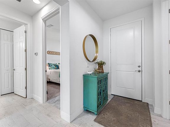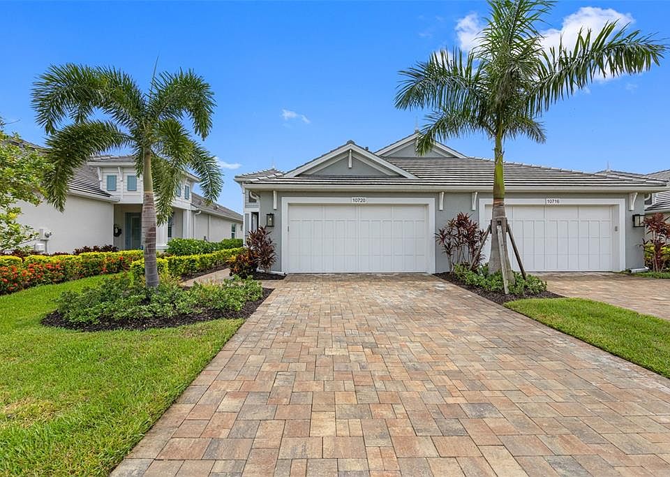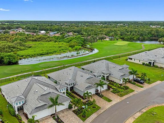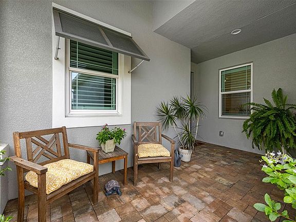 Located within the gated community of Watercolor Place, this 2022-built coastal-style villa perfectly blends modern luxury with low-maintenance living. Built with IMPACT WINDOWS AND DOORS, it offers lasting durability and peace of mind. The exterior showcases a tile roof, paver driveway and sidewalks, and lush tropical landscaping, creating an inviting curb appeal. This desirable Captiva floor plan features 2 bedrooms, 2 baths, a private den with doors, and a 2-car garage. Inside, a light-filled, open-concept design is enhanced by a soothing neutral palette, tray ceilings, plantation shutters, wood-look plank tile flooring, and upgraded ceiling fans throughout. The chef’s kitchen is a true highlight, boasting smart appliances, a gas cooktop with hood, convection oven/microwave combo, quartz countertops, a center island with breakfast bar, and a spacious pantry. The primary suite offers a walk-in closet and a spa-like en-suite bath with dual vanities and a private water closet. Step outside to the screened lanai and take in serene views of the golf course, pond, and wooded backdrop—perfect for morning coffee or evening gatherings. With no CDD fee and an affordable HOA that includes cable, internet, lawn care, and access to recreation facilities, this home provides exceptional value. Community amenities include a clubhouse with pool, spa, and outdoor grilling area, and pickleball enthusiasts will love having the UMR Sports Complex just across the street. Ideally located near I-75, this home offers an easy drive to Sarasota, St. Petersburg, Tampa, and the stunning west coast beaches, with multiple airports also within an hour’s drive. Costco, shopping, brand new Target and dining are just minutes away, putting the best of Florida living at your fingertips. Schedule your private showing today and experience the lifestyle Watercolor Place has to offer!