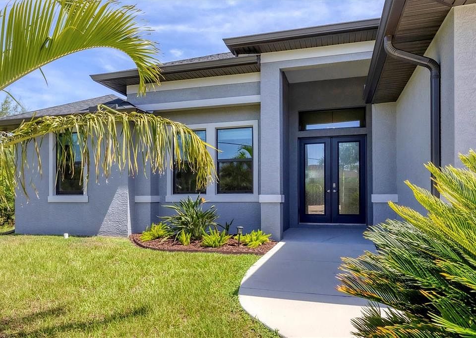 Priced to SELL!!! Welcome to this impeccably maintained home, built in 2020, where modern luxury meets unparalleled comfort. Nestled in the tranquil neighborhood of South Gulf Cove, this residence is framed by mature landscaping and enjoys sought after southern exposure. This home boasts a host of premium features designed for both style and convenience. Step through the grand double front doors into a bright and airy living space adorned with volume tray ceilings and pristine porcelain wood tile floors. The expansive great room is seamlessly connected to the outdoors through fully pocketing zero-degree sliders, providing effortless flow to the lanai. The gourmet kitchen is a chef’s dream, featuring two-toned solid wood custom cabinets with soft-close doors and drawers, a large island with additional upfront storage, and stunning granite countertops. Equipped with a convection oven, microwave, and a large pantry, this kitchen offers both functionality and elegance. The den, with its large windows, provides a versatile space perfect for a home office or study. The spacious primary suite is a true retreat, complete with sliders leading to the lanai and a stylish tray ceiling. The luxurious primary bath features double sinks, a walk-in shower with upgraded tile and a marble floor, and a generous walk-through closet with built-ins that conveniently connects to the laundry room. The laundry room itself is well-appointed with cabinetry and a utility tub.  On the opposite side of the home, your guests will appreciate total privacy with 2 spacious bedrooms and a full bathroom which provides direct access to the pool/lanai area.  The outdoor space is equally impressive, featuring a screened lanai with an outdoor kitchen equipped with marine-grade cabinets, a fridge, sink, and a sit-up bar! Family and friends will all enjoy floating in the saltwater HEATED pool or sitting out in chairs on the sun shelf. And an outdoor shower makes it easy to clean up after any landscaping chores, all while being enclosed by a 6-ft vinyl privacy fence for complete seclusion. Additional features include hurricane protection with impact glass windows and doors, Kevlar shades on the lanai, and a generator transfer switch for peace of mind. Don’t miss the opportunity to own this beautifully crafted home where every detail has been thoughtfully designed for your comfort and enjoyment.
