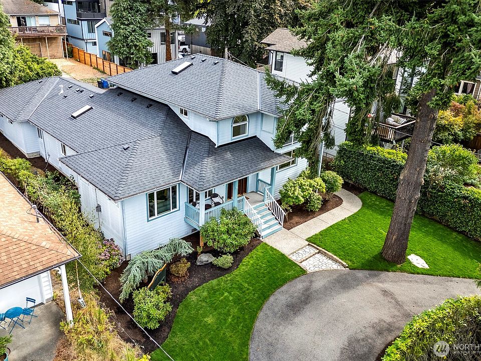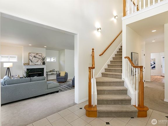 Beautifully maintained Northwest Seattle home offering comfort, flexibility, and timeless appeal. Mature landscaping and a circular drive create a welcoming first impression with extra parking for guests. Inside, the dramatic two-story entry opens to sunlit living and dining areas anchored by a cozy gas fireplace. The kitchen features abundant cabinetry and counter space, plus a cheerful nook with access to a private patio and oversized two-car garage. The main-floor primary suite includes a walk-in closet and spa-like bath, plus a second bedroom and full bath. Upstairs offers a loft, bedroom, and a fourth bedroom or bonus room with balcony, full bath, and storage. Prime location near Carkeek Park, Greenwood, shops, dining, and transit.