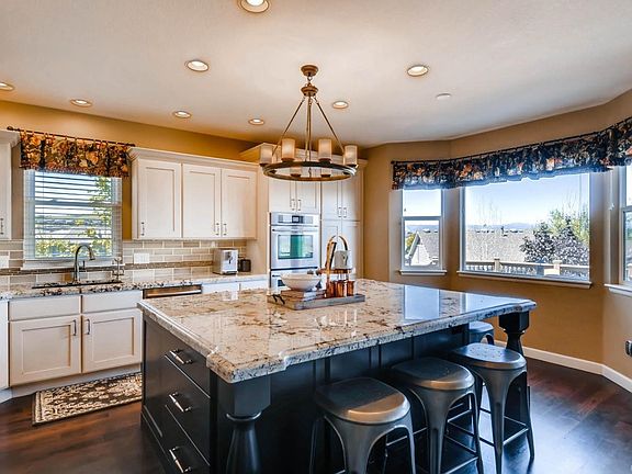 Enjoy SPECTACULAR FRONT RANGE VIEWS & OUR BEAUTIFUL COLORADO SUNSETS from the deck of this well designed two story home in Highlands Ranch. Main floor features newly remodeled gourmet kitchen w/ huge island, slab granite countertops, stainless appliances & new cabinets. Cozy up in the family room w/ gas fireplace & enjoy the stunning views. Living room, dining room and powder room round out main level. Wide planked hickory floors are throughout main level. Upstairs you will find Master Suite, w/ spacious 5 piece master bath, walk-in closet with Elfa closet organization system. In addition to laundry, large secondary bedrooms and bathroom, you will have plenty of space in the spacious loft (could be used for office, play area, addl living area). Finished walkout basement includes additional living space & large bedroom w/ full bath & unfinished storage. One of the biggest yards in neighborhood. Tasteful decor throughout. Turn key and move-in ready. Make this your home TODAY!