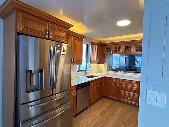 Gorgeous updated kitchenBreathtaking water viewsNew refrigeratorCorner unitBeautiful wood floorsBeautiful sunsetsNew white stone countertops