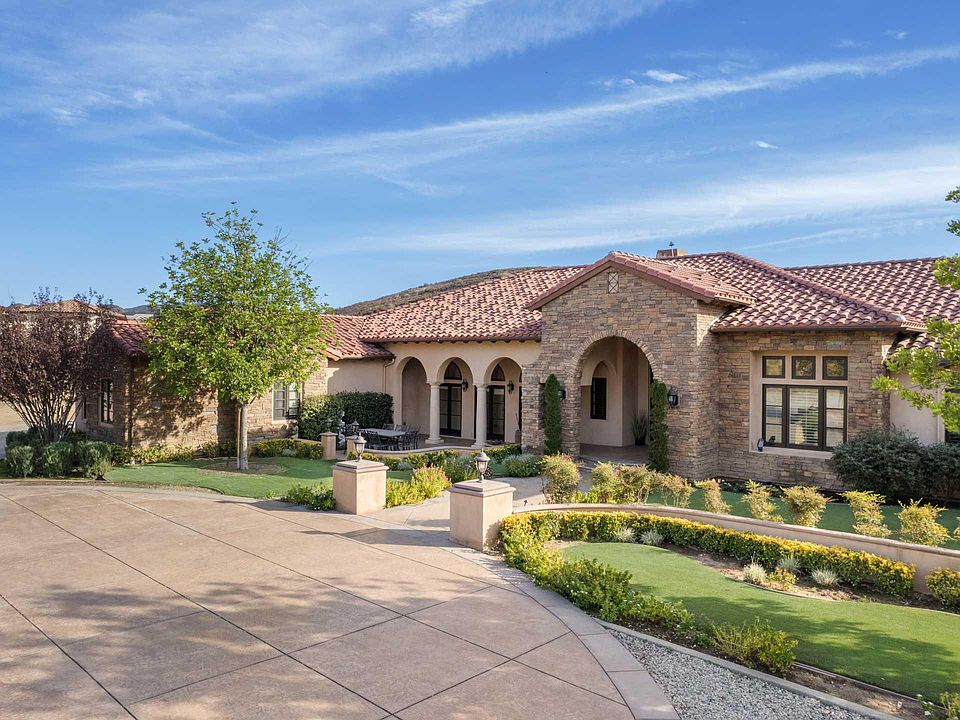 Custom single story home located within the exclusive gated community of Stallion Ranch Estates in Shadow Hills. This trophy estate is situated past a secondary gate for added security, on an expansive five acre lot featuring sweeping panoramic views of the city lights below. Elegant double metal doors greet you into the home. The spacious main living area allows for both grand entertaining and casual get-togethers. It consists of a living room with a gorgeous stone fireplace, formal dining room with french doors that open to the front courtyard and a family room that has another stunning fireplace, vaulted ceilings and a french door that looks out onto the backyard. The heart of the home is the eat-in chef's kitchen, which boasts top-of-the-line stainless steel appliances, granite counters, a massive center island, walk-in pantry and additional butlers pantry across the hall with two wine fridges. The master suite features a cozy fireplace, sliding glass door that leads out to the back patio, his/her walk-in closets and a spa-like bath designed with an oversized shower, jetted tub and dual vanities. Additionally you will find two ensuite bedrooms and two bedrooms connected by a jack and jill bathroom, each with their own walk-in closet. The spacious backyard boasts a large grassy yard, covered patio, infinity edge pool/spa and bocce ball court. With plenty of room to make additions. Top notch amenities include a bonus room, laundry room, built-in speakers, high ceilings throughout, a large circular motor court and four car garage. This property is zoned A1, allowing for a variety of land uses.